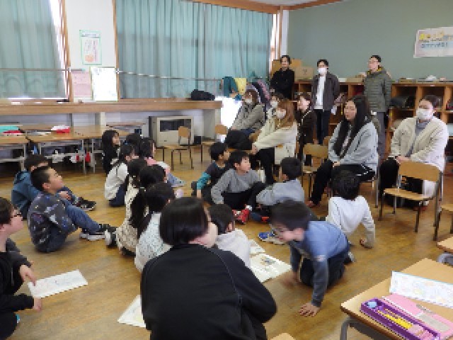2年生の3時間目は国際大学生を招いての国際交流会でした。まずは1人ずつ順番に自己紹介です。自分の名前と「自分ができること」を英語で伝えました。その後、「ずいずいずっころばし」「なべ、なべ、そこぬけ」「あんたがたどこさ」の3つの童歌で遊びました。まずグループでそれぞれの童歌でどんなことをするのかデモンストレーションをしました。みんなで一緒に歌いながら紹介しました。そして、各グループに1人ずつ国際大学生に入ってもらい、一緒に遊びました。