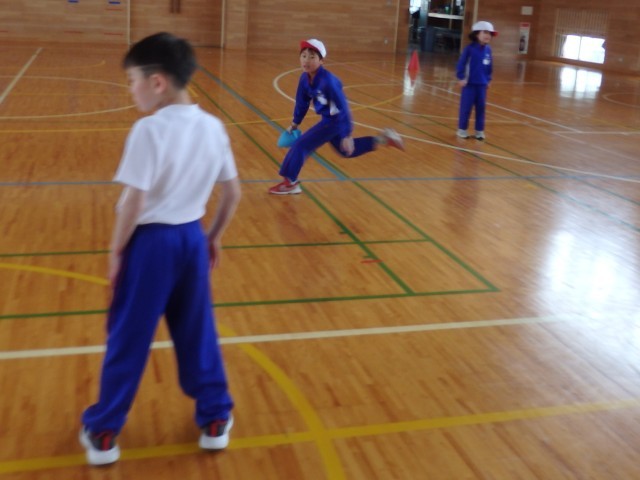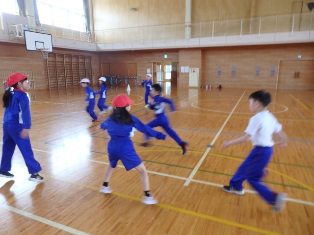 2年生の2時間目は体育の授業でした。「関所やぶり」というゲームをしていました。赤白対抗で守備チームは4人、3人、2人、1人と並びます。攻撃チームは一斉にスタートしてジャンケンをして勝ったら先に進み、負けたらいったん自分の陣地に戻って再スタートします。最後の1人にジャンケンで勝ったら1ポイントです。ジャンケンに勝っても負けても笑顔で楽しんでいました。