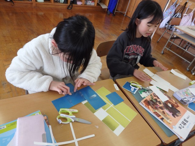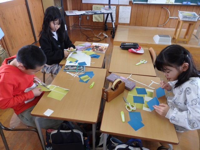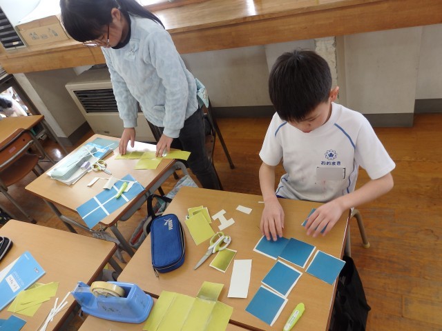 2年生の5時間目は図工の授業でした。先日の学習参観のときに廊下の窓に掲示してあった「光のプレゼント」という作品をバッグにしていきます。初めに先生の周りに集まって、バッグに変身させる手順のお手本を見せてもらいました。手順が分かったら作業開始です。「めっちゃ丁寧にやるんだ!」という子が何人もいました。