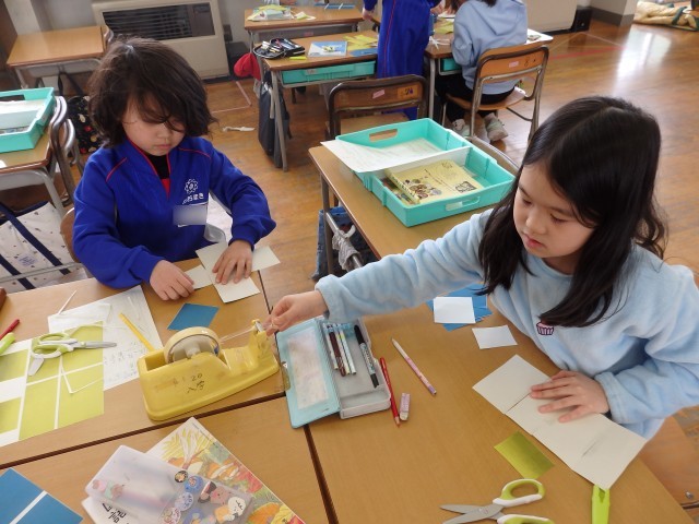 2年生の6時間目は生活の授業でした。「わたしたんけん」の学習で、自分の成長の歴史を綴っています。今日は、タイトルを考え、絵を描いて表紙を作りました。「ギャバンブック」、「ヨッシーコロコロコミック」、「わたしの思い出アルバム」、「自分の成長の本」、「小さいころアルバム」などのタイトルを付けていました。
