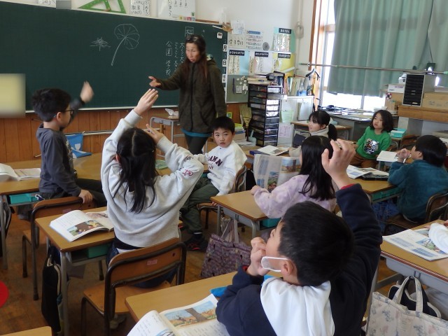 2年生の1時間目は国語の授業でした。「ことばあそびを楽しもう」の学習です。「数え歌」で出てくる「さんしょう」や「むくろじゅ」などの子どもたちにはあまり馴染みのないことばが何なのか電子黒板で写真を見たり、2,3人ずつのチーム戦でのしりとりをしたりして楽しく学習していました。