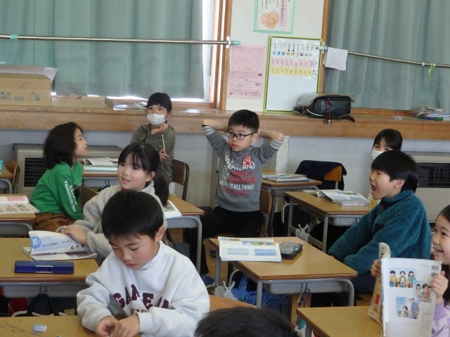 2年生の1時間目は国語の授業でした。「お手紙」という物語の学習です。まずは2,3人のグループになって丸読みをしました。その後、物語全体を4つの場面に分け、それぞれの場面がどういうお話なのかを読み取りました。友だちと協力して取り組んでいました。