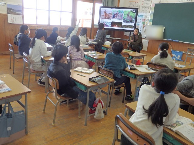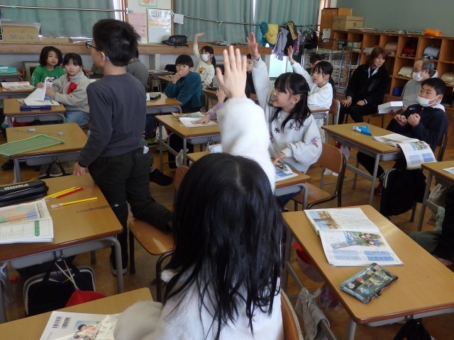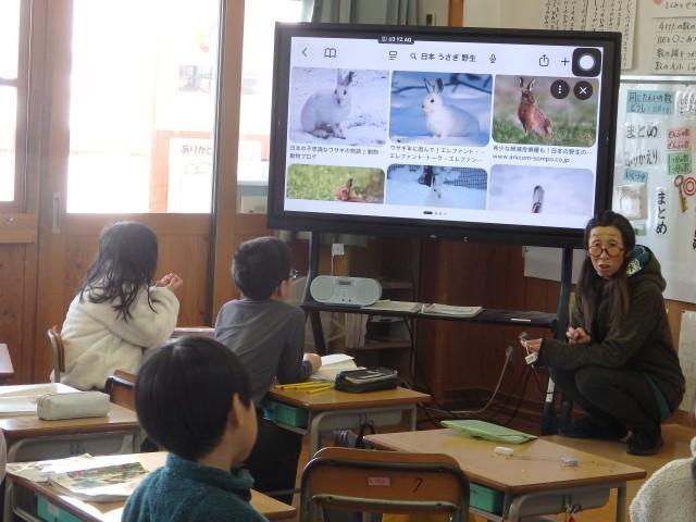 2年生の1時間目は道徳の授業でした。「桜の木と一緒に」という資料を読んで、自然の美しさや大切さについて考えました。資料では、主人公が季節ごとに学校にある桜の木の様子やエピソーオを話しています。読み終わったあと、自分の身の回りにある草木や花、生き物を季節ごとで考えました。たくさんの手が挙がり、たくさんの木や花の名前や生き物の名前が出されました。「ゆきうさぎ」という考えが出されたので、「ゆきうさぎ」の季節ごとの姿を写真で確かめました。