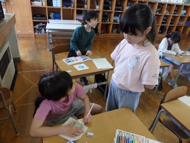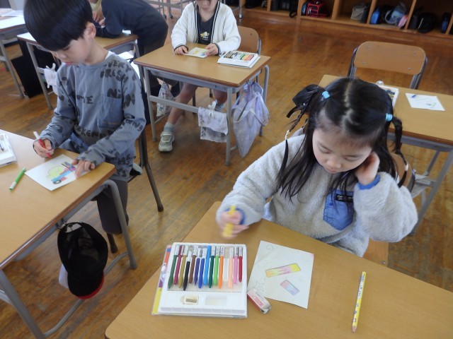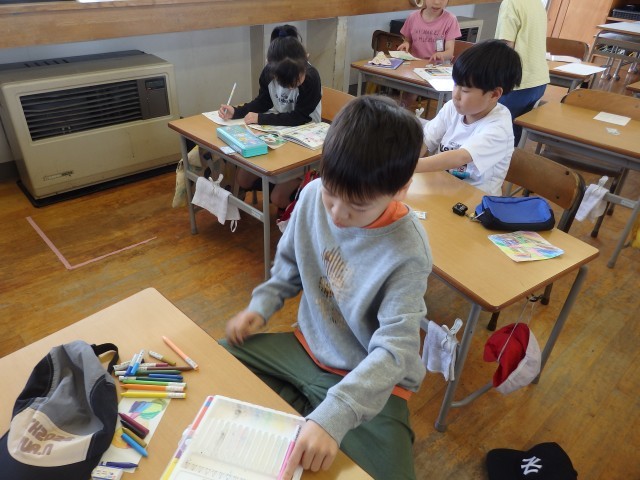 2年生の6時間目は生活の授業でした。「わたしたんけん」の学習で、自分の成長の歴史を綴っています。今日は、タイトルを考え、絵を描いて表紙を作りました。「ギャバンブック」、「ヨッシーコロコロコミック」、「わたしの思い出アルバム」、「自分の成長の本」、「小さいころアルバム」などのタイトルを付けていました。