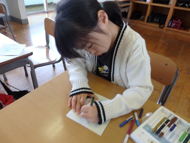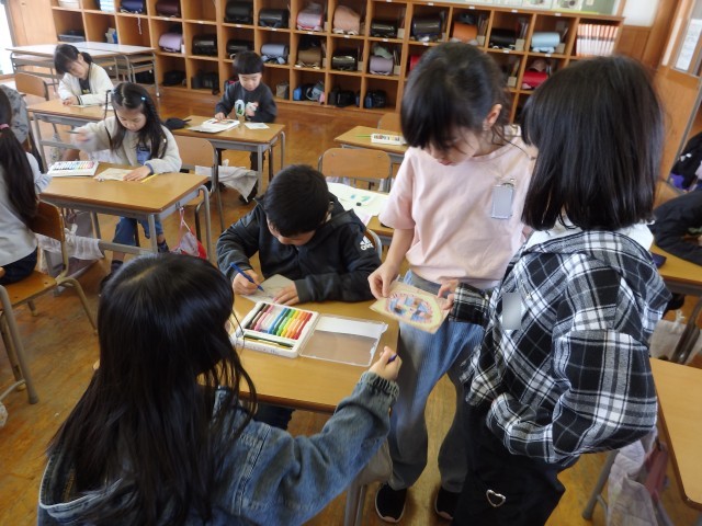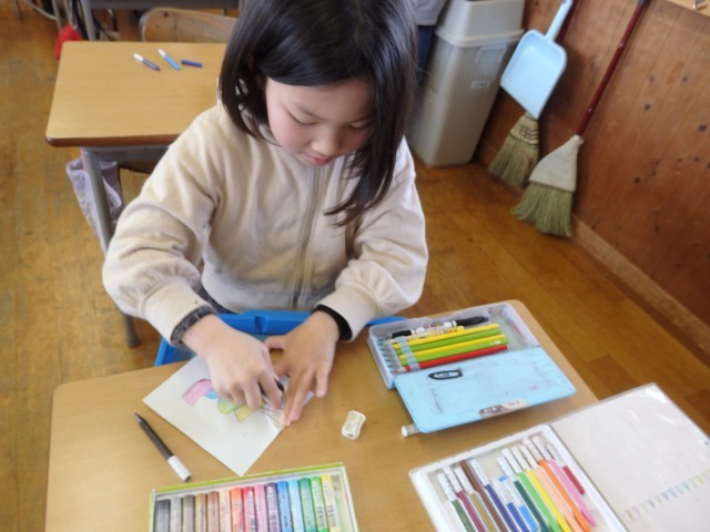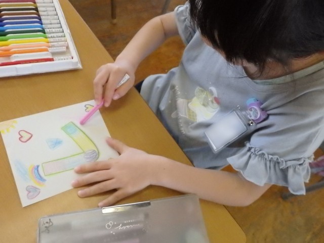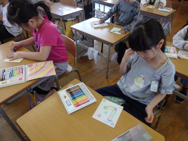 2年生の1時間目は生活の授業でした。学級目標を掲示するために、1人1文字で色塗りをしていました。友だちが持っていない色を貸してあげたりしながら、クーピーで丁寧に塗っていました。グラデーションを付けたり、いろいろな色を重ねて塗ったり、指でゴシゴシこすってぼやけさせたりと工夫していました。
