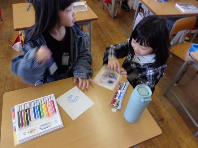 2年生の3時間目は学活の授業でした。2年生最後の「お楽しみ会」です。生活の授業で作った手作りおもちゃで遊びました。手で押して走らせる車、手裏剣、ストローで息を吹き付けて動かすイモ虫、下敷きで風を送って走らせる車など、作ったチームごとで出店風にして遊びました。「いらっしゃい、いらっしゃい!」と呼び込む声が聞こえてきました。折り紙で作った景品もありました。みんなで仲良く楽しそうに遊んでいました。