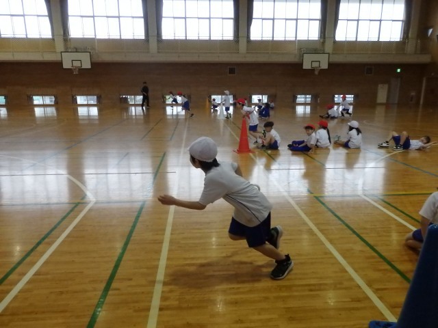 2年生の3時間目は体育の授業でした。体づくりの運動です。ウォーミングアップでオニごっこをした後、「ネコとネズミ」という活動を行いました。ネコ役とネズミ役に分かれて、先生が「ネコ」と言ったら、ネコ役の人が逃げます。ネコ役が壁に着く前にネズミ役の人がタッチできたらネズミの勝ちです。最初の体勢をいろいろ変えながら行いました。