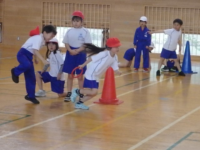 2年生の2時間目は体育の授業でした。「リング運びリレー」をしていました。リングを新聞紙の筒で押して運びます。2回戦して、1回戦目は筒が1本、2回戦目は筒2本で行いました。順番を持っている子たちが一生懸命に応援している姿がとてもよかったです。