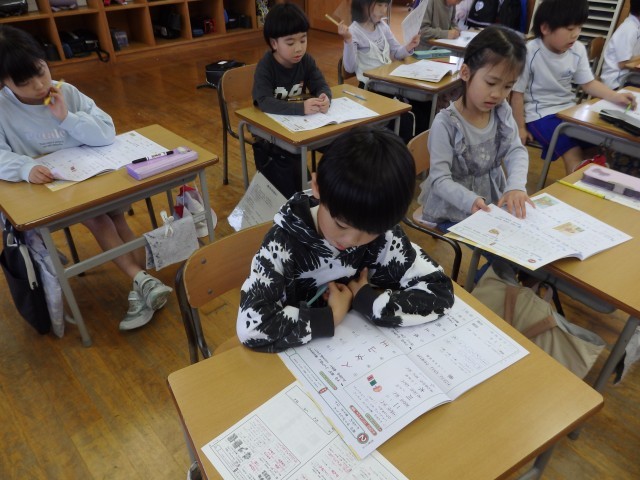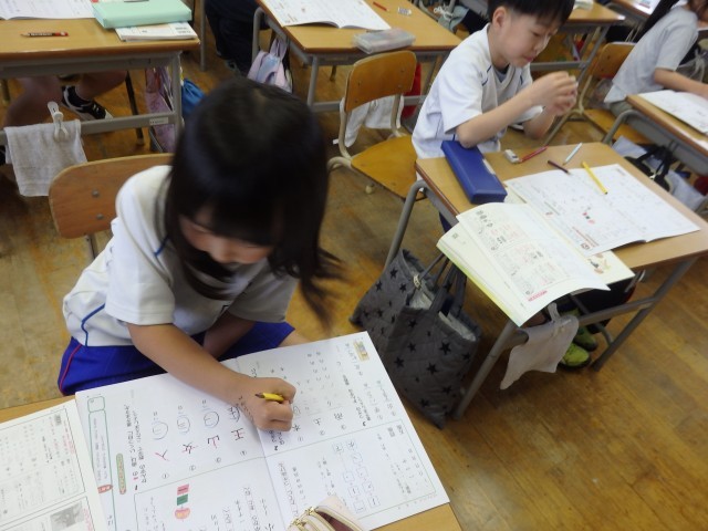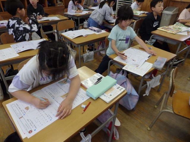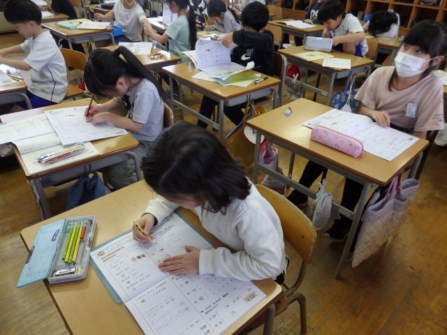 2年生の2時間目は書写の授業でした。書写ノートに取り組んでいました。みんなが静かに集中して取り組んでいました。シーンと静まりかえった中で、鉛筆の音だけが聞こえていました。終わった子は先生に見せて、「終わったシール」をもらいます。