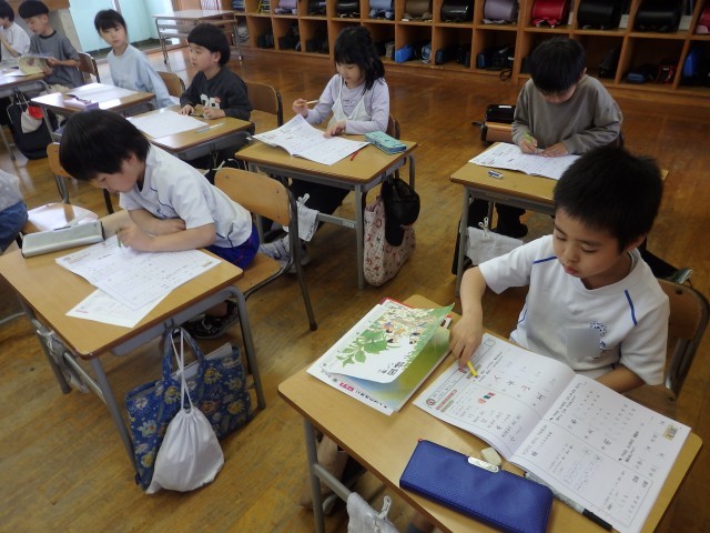 2年生の4時間目は国語の授業でした。「お手紙」の学習です。「手紙を一度ももらったことがないガマ君にカエル君が手紙を書き、カタツムリ君に届けてくれるようお願いする」という第2場面の内容を読み取りました。まずは2分間で何度も音読をしました。その後、内容についての問題プリントに取り組みました。