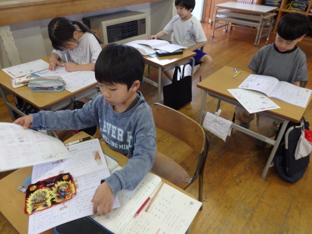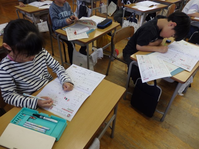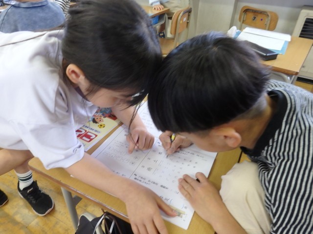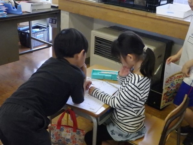 2年生の4時間目は国語の授業でした。「漢字の書き順」の学習です。教科書で「右」「左」「川」「小」のように似ている漢字でも書き順は違うことを学習した後、「ことばのドリル」を使って、書き順の問題に取り組みました。問題文の読み取りが少し難しい問題があったので、問題の意味を教え合いながら取り組んでいました。
