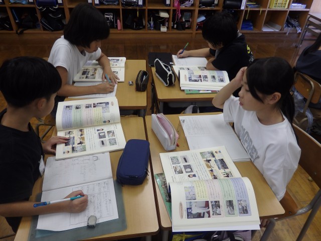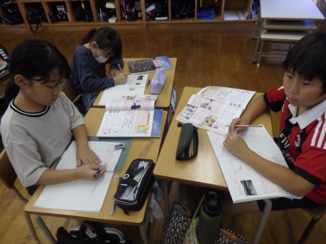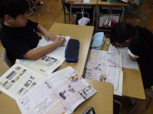 3年生の1時間目は国語の授業でした。「グループの合い言葉を決めよう」の学習です。話し合いを活発に行うためには司会者がたくさんの人の意見を引き出すことが大切だと前回の授業で学びました。今日は参加者の人たちはどうすればよいか考えました。まずは教科書に載っている話し合っている場面を読み、参加者のよいと思う意見のところに線を引きました。積極的に意見を出すことはもちろんですが、理由を付けて話すことが大切だと学びました。それをふまえて、班ごとで『ドラえもんの道具で欲しいものは何か』について班ごとで話し合いました。