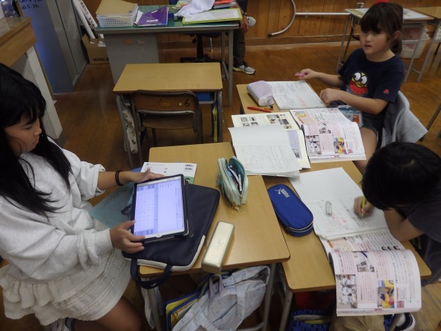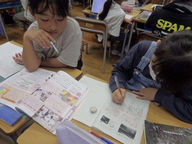 3年生の3時間目は総合の授業でした。学習発表会で発表するために先生が作ったシナリオの原案を班ごとで検討して、「こんな場面を加えたい」「こんなセリフにしたい」などのアイデアを出し合っていました。「あ~、なるほど!」「おもしろい!」というアイデアがたくさん出されていました。