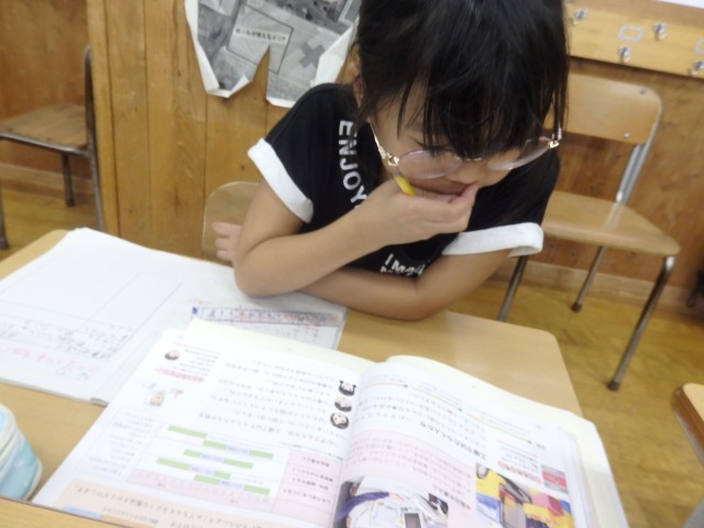 3年生の3時間目は算数の授業でした。あまりのある割り算の学習です。「23個の栗を4個ずつ袋に入れると、何袋できて何個あまりますか」という問題に取り組んでいました。教科書に載っている2人の子の意見を読んで、「分かったこと」や「違うところ」「こういうことじゃないかな」などの意見を出していきました。