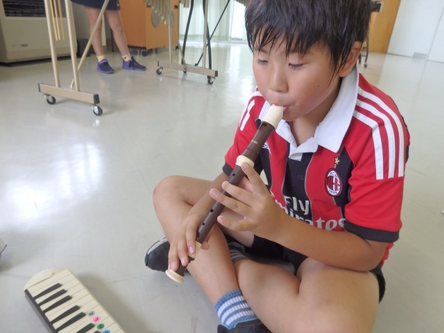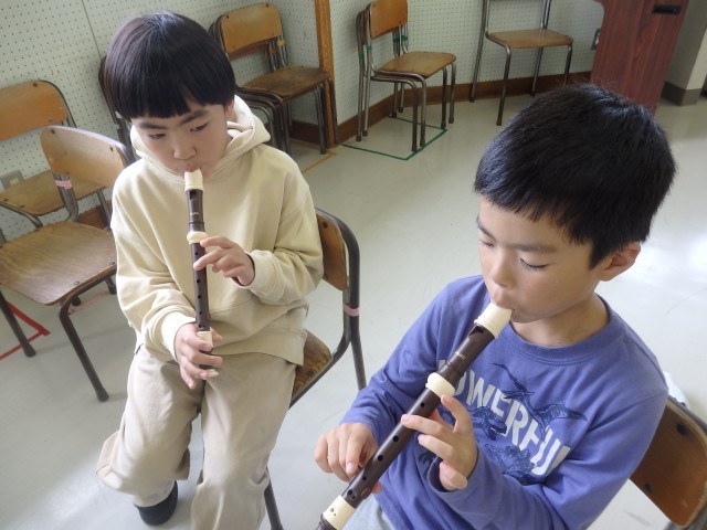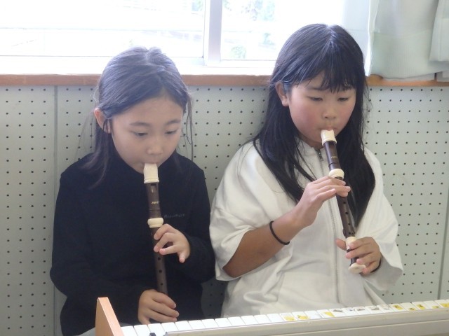 3年生の5時間目は音楽の授業でした。「パフ」という曲をリコーダーで演奏する練習をしました。まずはリコーダーは使わずに、音階を口ずさみました。音階でスムーズに歌えるようになったら、いよいよリコーダーです。何小節かごとに分けながら、みんなで一緒に演奏しました。楽譜に集中して吹いているのがよく分かりますね。
