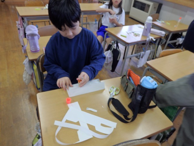 3年生の5時間目は総合の授業でした。学習発表会の準備をしていました。発表のときに使う小道具づくりです。劇の役割ごとで分担し、協力して取り組んでいました。