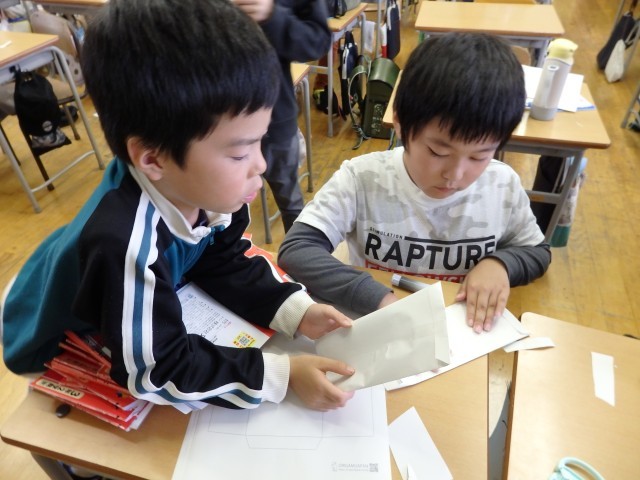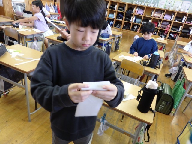 3年生は6時間目にPTA学年行事を行いました。「紙飛行機大会」です。種目は2つ、「距離」と「時間」の長さを競います。お家の人が子どもの頃の記憶を蘇らせたり、スマホで『よく飛ぶ紙飛行機の作り方』を調べたりしながら、親子で仲良く紙飛行機を作っていました。さて、うまく「飛ぶ紙飛行機」はできたでしょうか。
