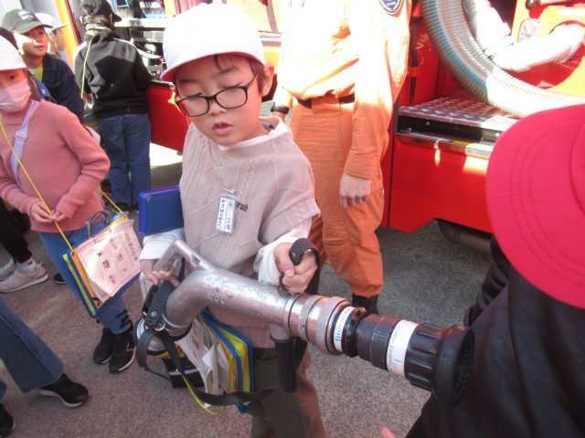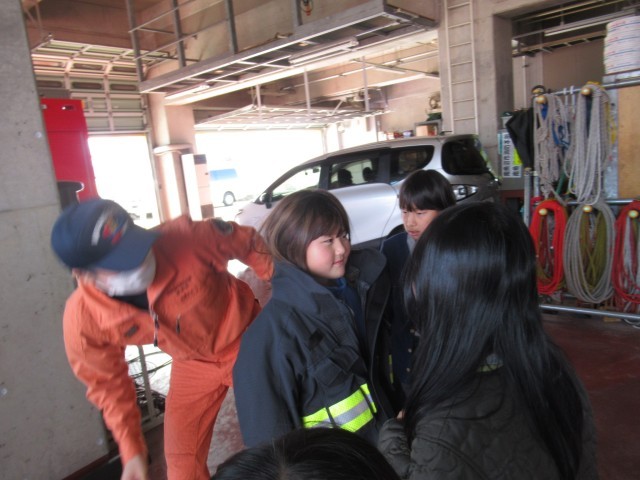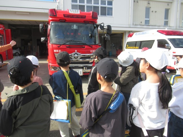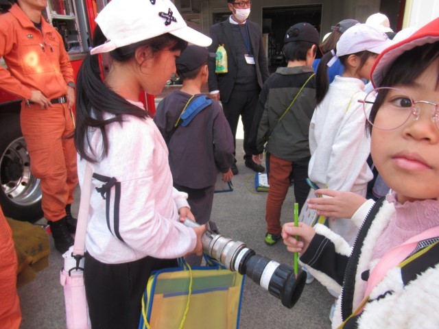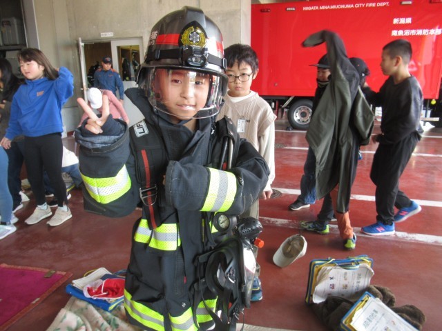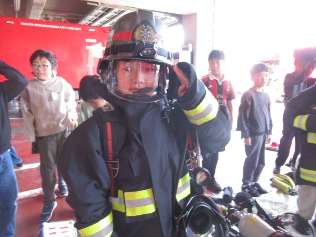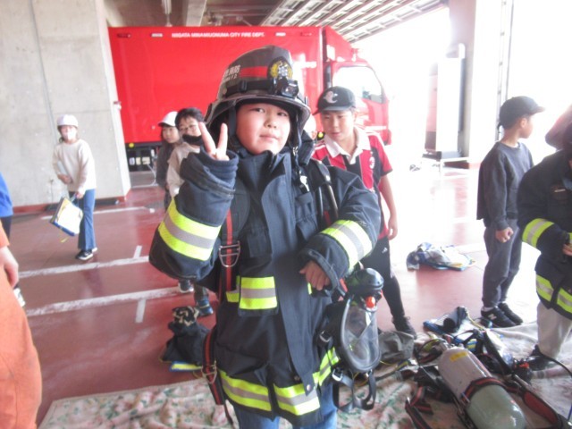 3年生は2,3時間目に南魚沼市消防署の見学を行いました。消火ホースを持たせてもらったり、防火服を着させてもらったり、救急車の中に入らせてもらったり、はしご車に乗せてもらったりと貴重な体験がたくさんできました。