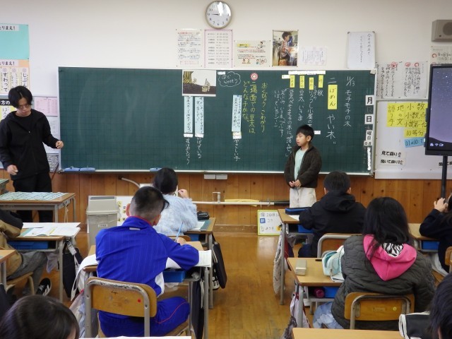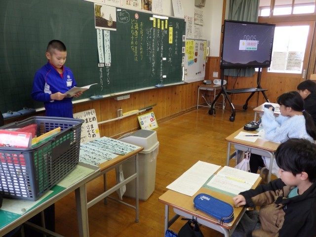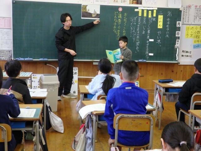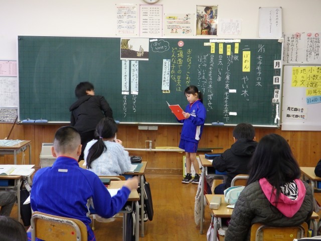 3年生の2時間目は国語の授業でした。「モチモチの木」の学習です。昨日書いた初読の感想を発表していきました。次から次へと手が挙がり、代理発表も含めて全員の子が感想を発表することができました。