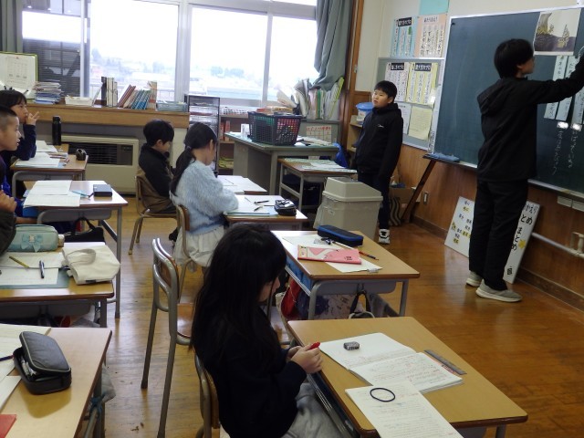3年生の4時間目は国語の授業でした。今日は「せっちゃくざいの今と昔」のテストです。テストを始める前に「温かい」「短い」などの漢字の送り仮名などのポイントを確認しました。