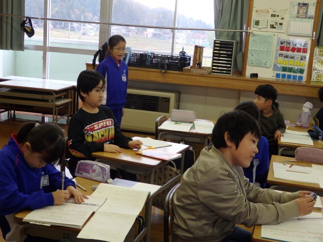 3年生の4時間目は国語の授業でした。「モチモチの木」の学習です。第1場面の「時」「場所」「登場人物」「できごと」を確認してから、「(主人公の)豆太はどんな子なのか」を考えました。「○段落に~と書いてあるから・・・だと思います」と教科書に書かれていることを根拠に発表することができました。また「○○さんの意見に付け足しです」などの発言もあっていいですね。