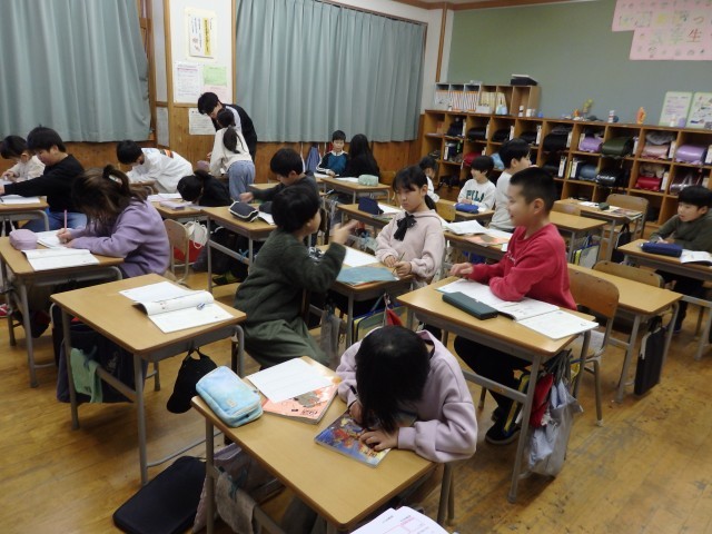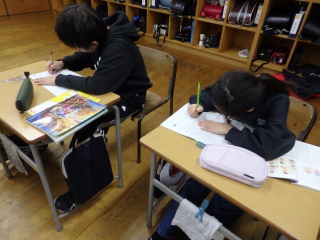 3年生の5時間目は図工の授業でした。「あの日あの時の気持ち」という絵の制作の最後です。完成して先生に提出した子は読書をしたり、お絵かきしたり、ドリルをしたりなどをしていました。終わっていない子のお手伝いをしてくれる子が数人いました。和気あいあいとした「ほんわか」ムードで過ごしていました。