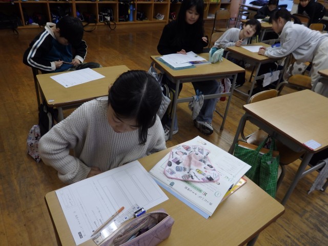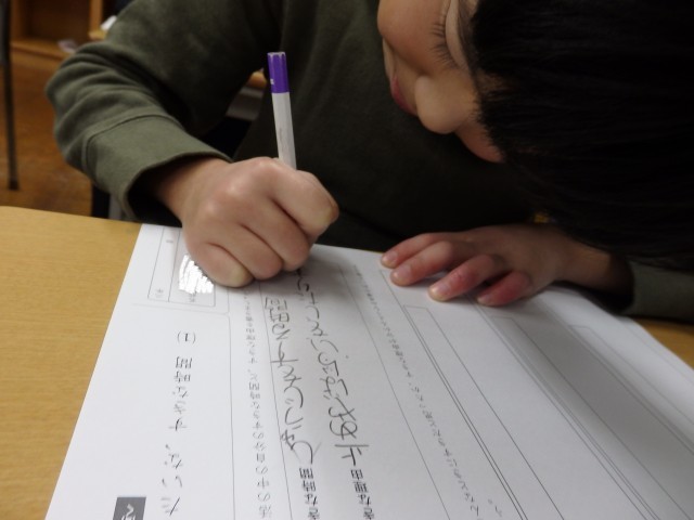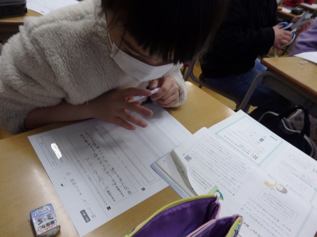 3年生の4時間目は国語の授業でした。今日は「せっちゃくざいの今と昔」のテストです。テストを始める前に「温かい」「短い」などの漢字の送り仮名などのポイントを確認しました。