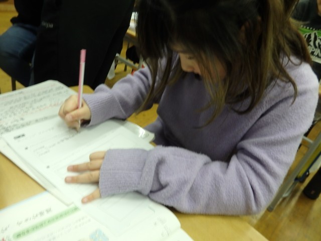3年生の2時間目は算数の授業でした。万の位、千の位などが混じった大きな数の学習です。「どんどんコース」「ちゃくちゃくコース」「じっくりコース」の3コースのグループに分かれて、プリントに取り組んでいました。グループの中で教え合ったりしながら、集中して取り組んでいました。