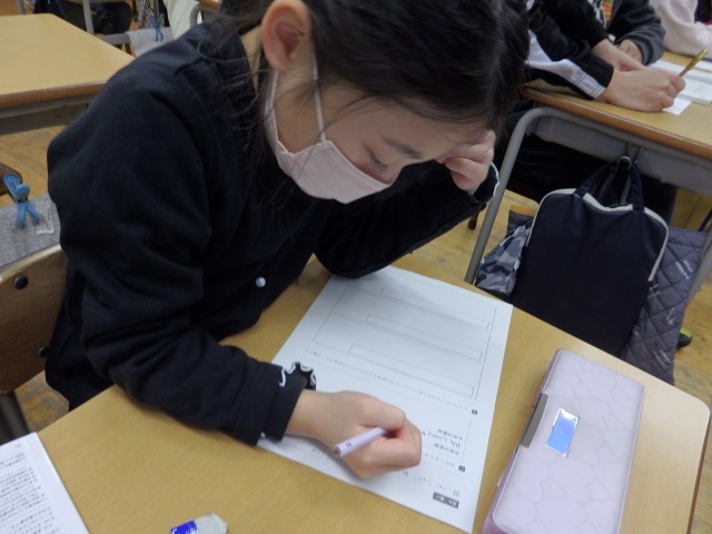 3年生の1時間目は学活の授業でした。「いじめゼロのために大切なこと」は何かを一人一人が考えました。「相手の気持ちを考える」「あたたかいメッセージを多くする」「暴力・暴言をしない」「自分がされて嫌なことはしない」などの意見が出されました。中には「した方がいいこと」と「してはいけないこと」に区別して具体的に考えた子がいました。今日、出された意見はどれも大切なことばかりです。一人一人が真剣に向き合い、生活してほしいです。