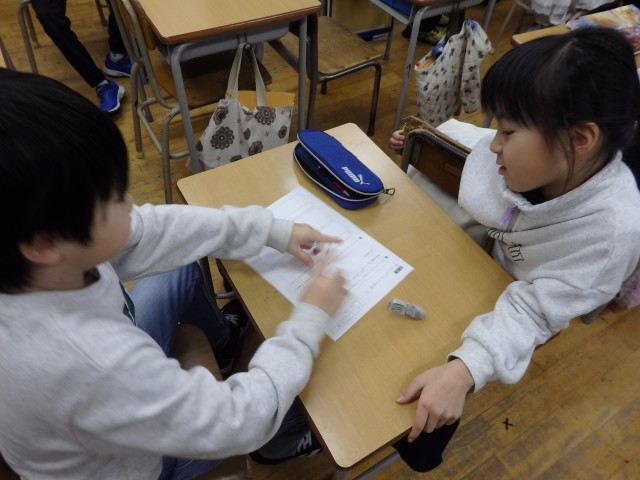3年生の1時間目は算数の授業でした。今日は数多くの問題に取り組む授業でした。小数についての問題プリントが4枚配られ、グループで机を合わせて取り組みました。「じっくり」「ちゃくちゃく」「どんどん」の3グループで教え合いながら一生懸命に取り組んでいました。