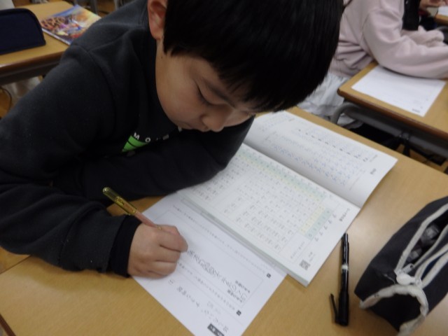 3年生の3時間目は国語の授業でした。ドリルを使って、漢字の学習をしていました。「飲」「流」「銀」などの漢字の音・訓読みや書き順を確認して、ドリルに書いて練習していました。
