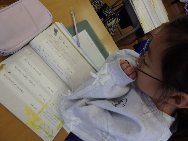 3年生の4時間目は国語の授業でした。「話したいな、好きな時間」の学習です。前の時間に書いた「好きな時間」についての原稿を見ながら、みんなの前で1人ずつ発表していきました。みんなに語りかけるような口調でとても上手に発表できた子がたくさんいました。また、原稿を見ないで発表した子がいたり、昨日までお休みしていた子は原稿なしで即興で発表していました。