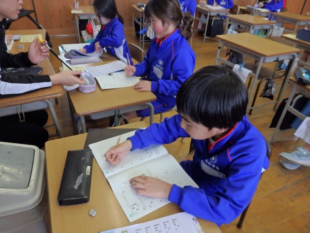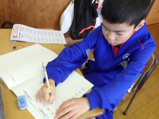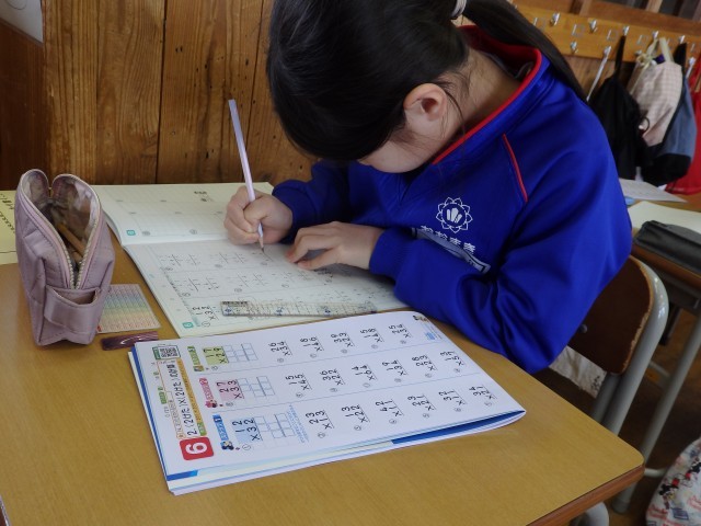 3年生の4時間目は算数の授業でした。計算ドリルで「2けた×2けたの計算」の問題をひたすら解いていました。1人で黙々と取り組んだり、机をくっつけて分からないところを教え合いながら取り組んだりしていました。みんながとても集中して一生懸命に取り組んでいました。