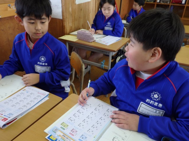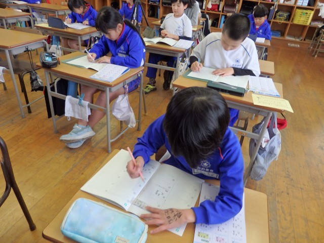 3年生の3時間目は国語の授業でした。ドリルを使って、漢字の学習をしていました。「飲」「流」「銀」などの漢字の音・訓読みや書き順を確認して、ドリルに書いて練習していました。