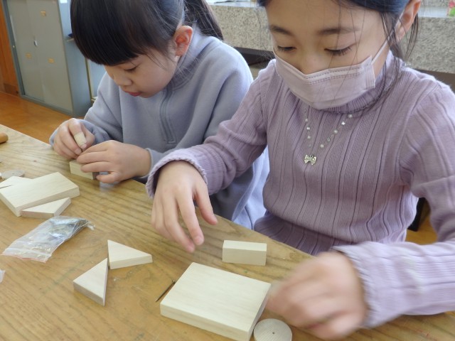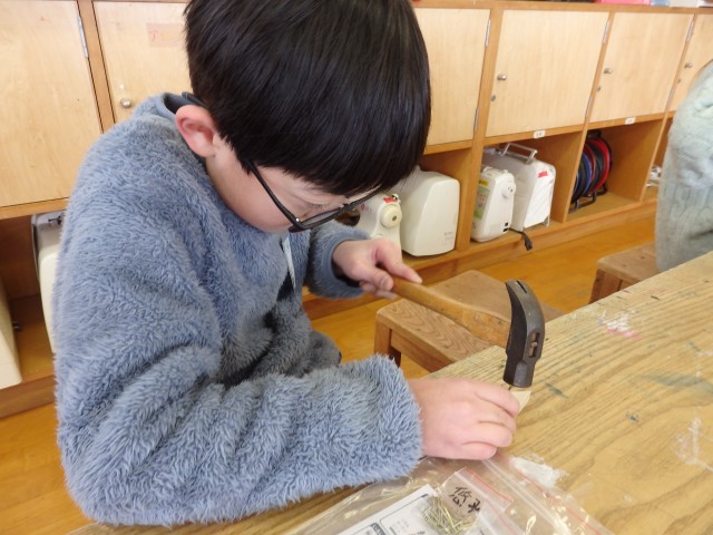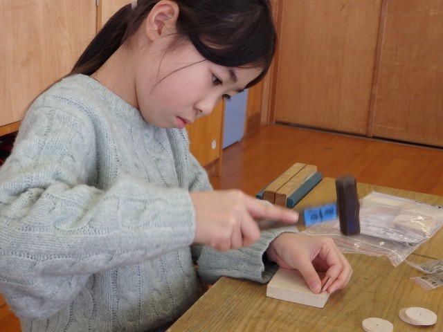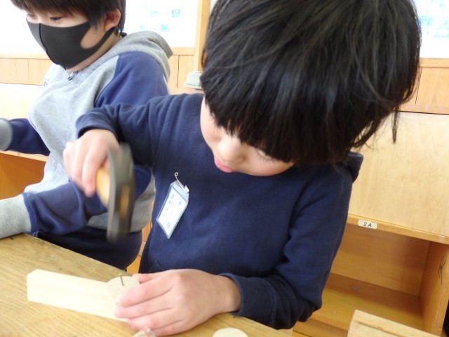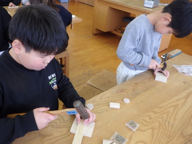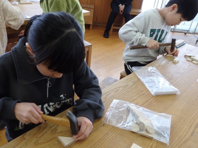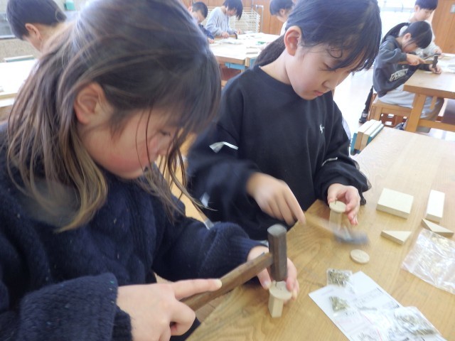 3年生の3時間目は図工の授業でした。「トントンどんどんクギうって」という木工制作の学習です。三角形や四角形、丸い形の木材をクギで打って好きな形に組み立てていきます。今日は初めてなのでクギを打つ練習をしました。初めてなので釘が曲がってしまったりして思うように打てませんでしたが、何度も何度もトントントントン練習していました。