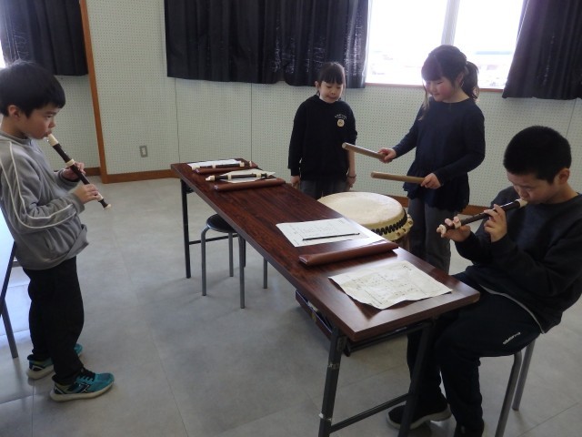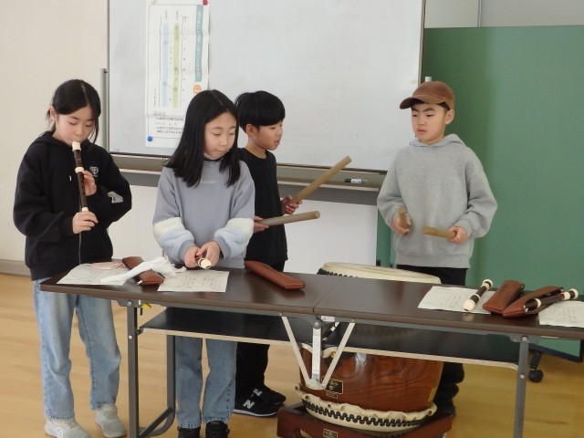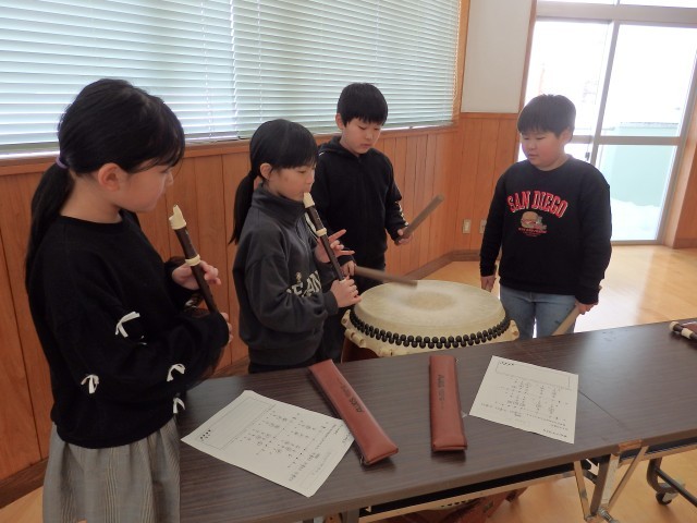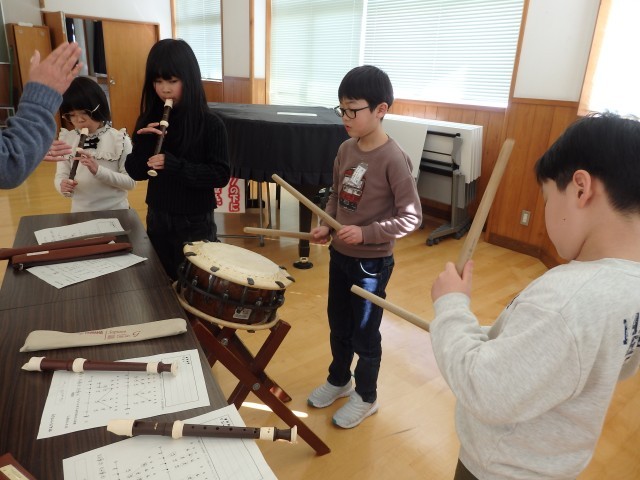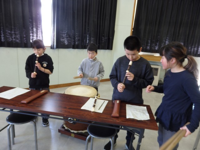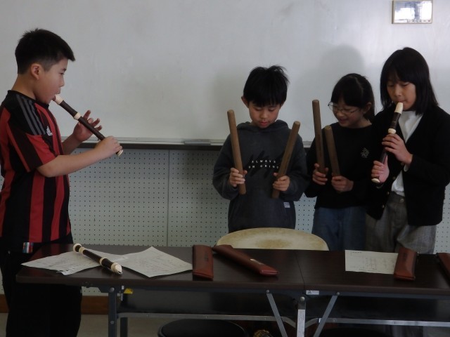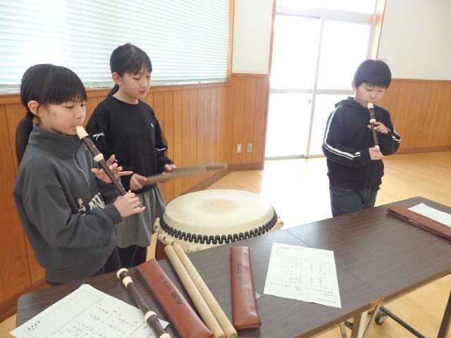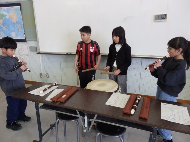 3年生の3時間目は音楽の授業でした。お囃子の学習です。昨日、練習した太鼓のリズムに合わせて、リコーダーでオリジナルの旋律を演奏します。「天テ、ツクツク・・・」を2回繰り返したら役割をチェンジしていきます。班ごとで声を掛け合ったりしながら協力して取り組んでいました。