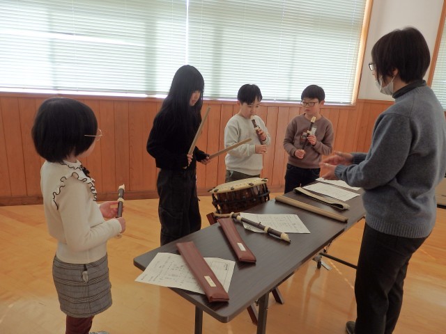 3年生の5時間目は音楽の授業でした。日本の伝統的な音楽であるお囃子の学習です。12月から勤務している事務員さんは以前に「五日町太鼓保存会」に所属し、その後、「五日町太鼓クラブ」で小学生に太鼓を指導していました。そこで「地域の達人」としてお囃子のリズム「天テテ、ツクツク、天ステ天、ヤー!」の指導をしてもらうことに。まずは太鼓や篠笛などの楽器についてのお話を聞きました。お父さんが保存会に所属している子もいるので興味津々でした。