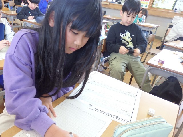 3年生の4時間目は算数の授業でした。計算ドリルで「2けた×2けたの計算」の問題をひたすら解いていました。1人で黙々と取り組んだり、机をくっつけて分からないところを教え合いながら取り組んだりしていました。みんながとても集中して一生懸命に取り組んでいました。