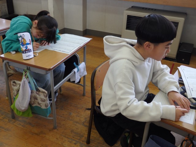 3年生の1,2時間目の様子です。昨日の国際科で作っていたクリスマスカードを仕上げたり、宿題やプリントなどの配付物を配っていました。配り係の子たちが協力しながら配ってくれていました。