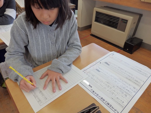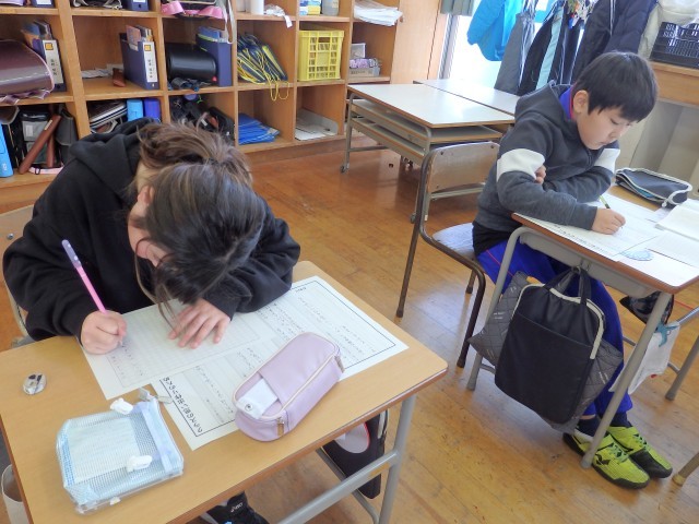 3年生の1時間目は国語の授業でした。「クラスの思い出作りのために」という学習です。実際に3年生の思い出を作るために、クラスでどんなことをしたらいいと思うかという提案文を書いていました。サッカー、バスケ、雪合戦、お絵かき伝言ゲーム、シール交換会、きつね狩りなどいろいろな提案文が書かれていました。自分の「やりたい」気持ちだけを書くのではなく、「それによってどんないいことがあるのか」などの理由もしっかり書いていました。