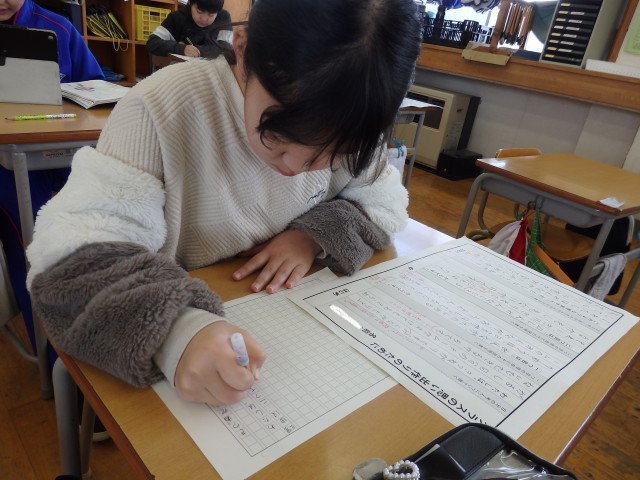 3年生の1時間目は学活の授業でした。12月の生活目標「自分も友だちも大切にしよう」の振り返りをしていました。「友だちと遊ぶときに、どんなことがしたいのか理由も伝えることができた」「人に話しかけるときに「さん」付けで呼ぶことを意識した」「相手の話もしっかり聞けたし、自分の考えも伝えられた」「相手の顔を見て話が聞けたし、朝のあいさつもしっかりできた。次はもっと難しいことに挑戦したい」などの振り返りが書かれていました。