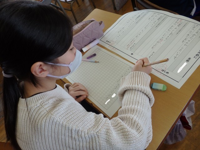 3年生の2時間目は国語の授業でした。「話したいな、好きな時間」の学習です。みんなの前で発表するための原稿を書きました。まずは教科書の動画を視聴して、発表の仕方や発表原稿のポイントを考えました。「ゆっくり話している」「自分の気持ちが入っている」「聞く人に問いかけている」などの考えが出されました。その後、「初め」「中」「終わり」でどんな内容を書いたらいいのか確認してから、原稿書きを始めました。明日の授業で発表するようです。楽しみです。