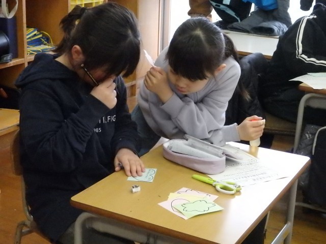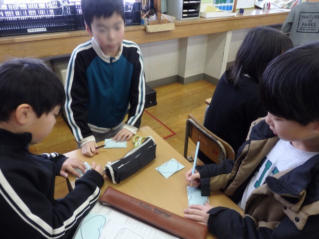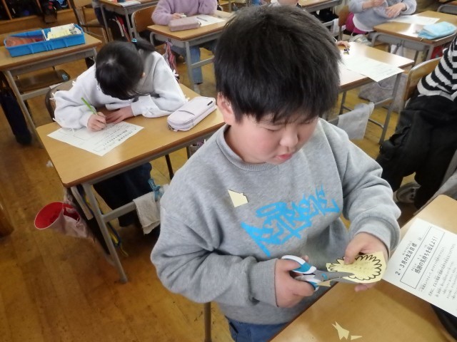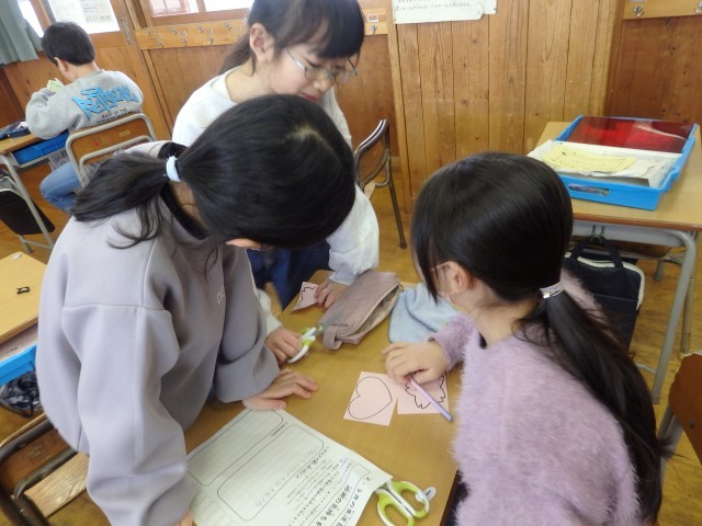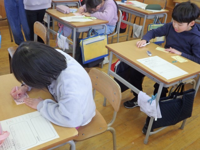 3年生の6時間目はお楽しみ会を行いました。今日を最後に転校してしまう友だちとのお別れ会でもあります。まずは体育館で「きつね狩り」を行いましたが、司会担当の子たちはみんなよりも早めに戻って次のプレゼント渡しの準備をしてくれました。プレゼントは1人1人が手作りした折り紙のカエルや花束、木材で作った○×ルーレットなど、どれも心のこもった物ばかりでした。○×ルーレットで「また、みんなに会えるか」を占って、○が出たのでみんな大喜びでした。お互いに元気で、それぞれの場所で友だちと仲良く過ごしてほしいです。