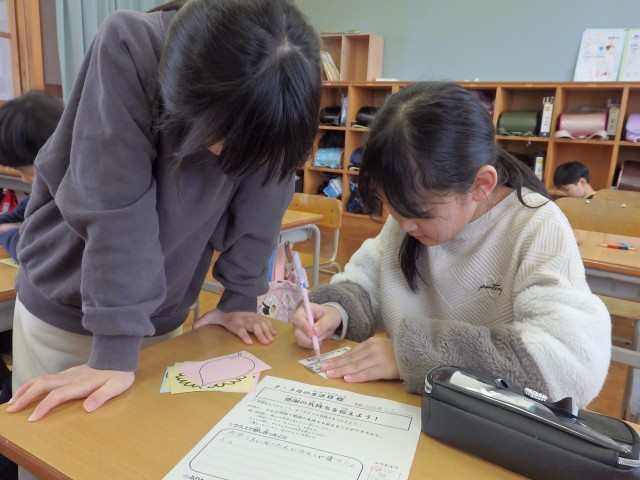 3年生の1時間目は学活の授業でした。2,3月の生活目標「感謝の気持ちを伝えよう」の取組である「ありがとうメッセージ」を書いていました。クラスの友だちやひまわり班の人、登校班の5,6年生に宛てて、「~のとき○○してくれてありがとう」と感謝の気持ちを丁寧に書いていました。配られた3枚のカードに書き終わって「もっと書いていいのかな?」と話している子がいました。