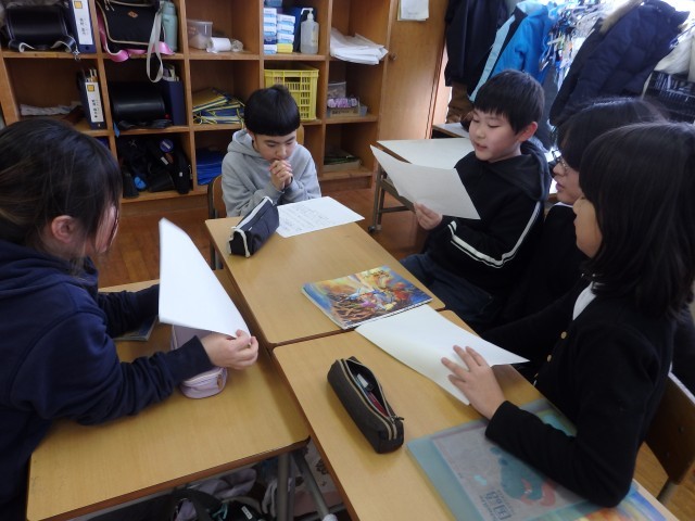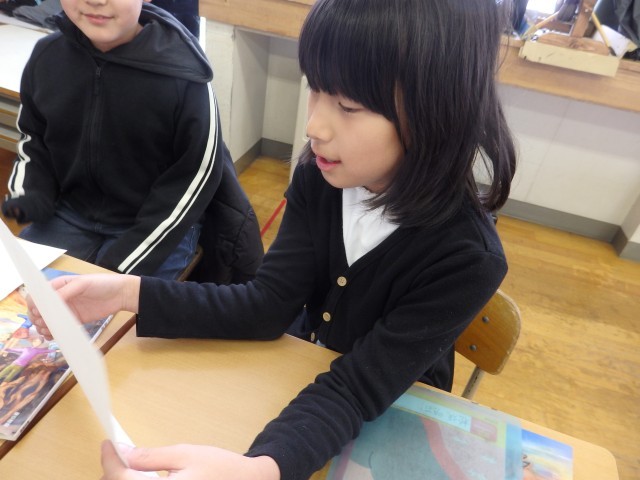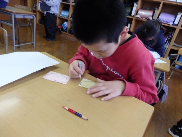 3年生の5時間目は国際科の授業でした。いろいろな形の英語での言い方の学習です。いろいろな色の三角形、長方形、星、ハートの折り紙でクリスマスカードを作りました。自分が欲しい折り紙を、お店屋さん役の2人の先生に注文します。「スリー グリーン トライアングル、プリーズ」のように注文します。ゲットした折り紙でクリスマスカードにクリスマスツリーなどの装飾をしていきました。
