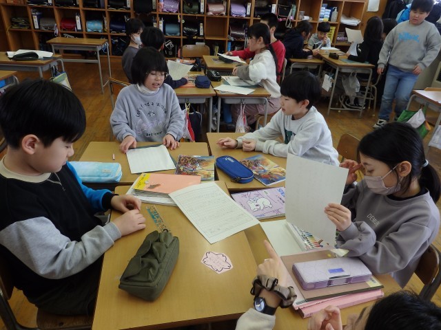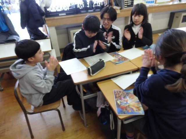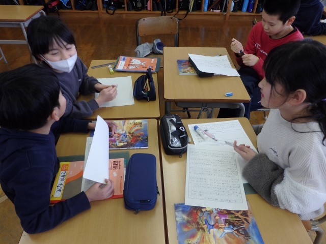 3年生の2時間目は国語の授業でした。「クラスの思い出づくりのために」という学習です。前の時間には「思い出を作るためにどんなことをしたらよいか」について、自分の提案を意見文として書きました。今日は意見文を班ごとで発表していきました。笑顔で発表していたり、発表が終わるとみんなで拍手したりする姿がいいですね。