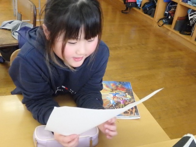 3年生の1時間目は国語の授業でした。「クラスの思い出作りのために」という学習です。実際に3年生の思い出を作るために、クラスでどんなことをしたらいいと思うかという提案文を書いていました。サッカー、バスケ、雪合戦、お絵かき伝言ゲーム、シール交換会、きつね狩りなどいろいろな提案文が書かれていました。自分の「やりたい」気持ちだけを書くのではなく、「それによってどんないいことがあるのか」などの理由もしっかり書いていました。