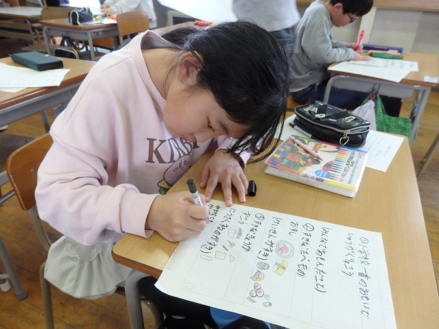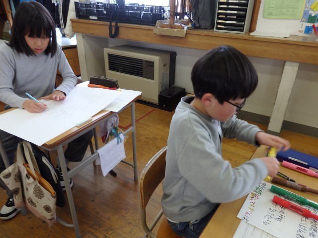 3年生の5時間目は図工の授業でした。3学期の係のポスターを作っていました。メンバーの名前、めあて、仕事内容を書いたら、イラストを描いたり文字に色を塗ったりして飾り付けをしていきました。「グラデーション付ける?」と凝っている係もありました。