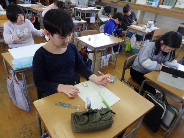 3年生の5時間目は図工の授業でした。席替えをしたようですね。紙版画の学習です。凸凹で模様が付いているいくつかの紙や毛糸などを貼り合わせて版画をします。今日は版画にする絵の下書きをしていました。タブレットで画像検索した絵を見ながら描いている子もいれば、何も見ないで描いている子もいました。トラック、日本庭園、飼っているペット、花などの絵を描いていました。「これを頑張って作るんだ」と描いた下絵を見ながら決意を語ってくれた子がいました。