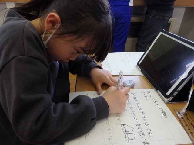 3年生の3時間目、国語の授業で「私の好きな時間」発表の続きです。ゲームをしているとき、習字をしているとき、犬の世話をしているとき、ドラムを叩いているとき、サッカーでボールを蹴っているとき、バスケでシュートが決まったとき、ピアノを弾いているときなど1人1人が「自分の好きな時間」について具体的に発表することができました。